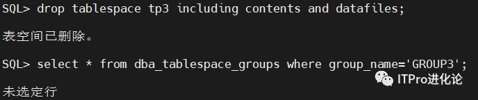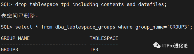 可以看到删除tp1临时表空间后,临时表空间组GROUP3仍然存在,只有删除该组中的全部临时表空间(即必须将临时表空间tp3也删除),组group3才能被删除。