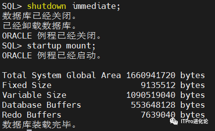 ②关闭并重新启动数据库。改变日志操作模式必须在MOUNT状态下进行,因此必须先关闭数据库,然后重新装载数据库。代码如下: