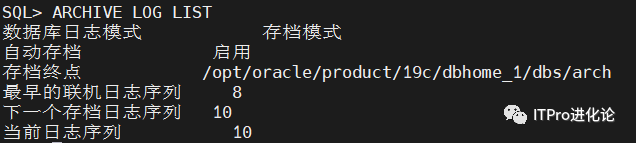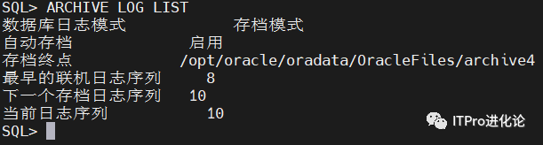 ⑤使用ARCHIVE LOG LIST命令查看数据库是否处于归档模式;