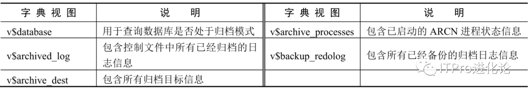 常用的各种包含归档信息的数据字典视图及其说明如下表示: