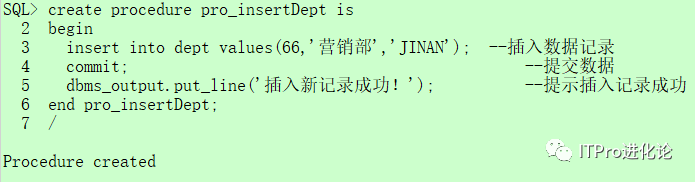 创建一个存储过程,该存储过程实现向dept表中插入一条记录,代码如下: