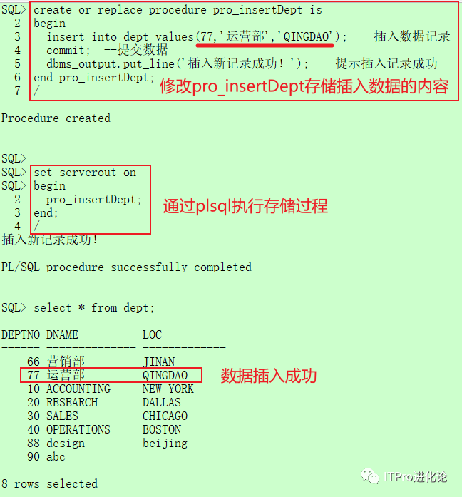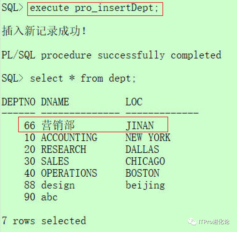 修改一下pro_insertDept存储过程插入的内容,然后再次执行PL/SQL块;