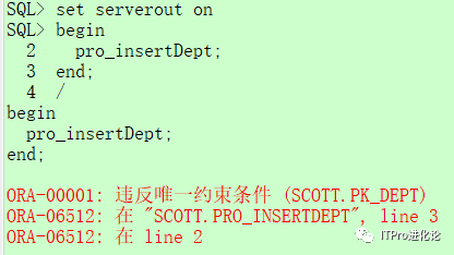 因为前面已经执行过一次pro_insertDept存储过程,已经向dept表插入一条deptno=66的数据了,不能再插入deptno=66的数据,提示违反唯一约束;