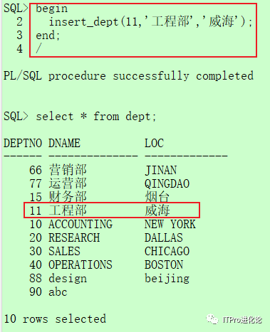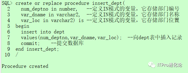 values(num_deptno,var_dname,var_loc); --向dept表中插入记录