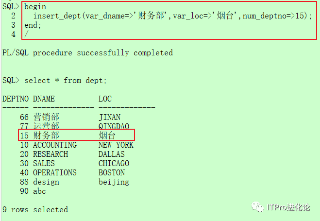 insert_dept(var_dname=>'财务部',var_loc=>'烟台',num_deptno=>15);