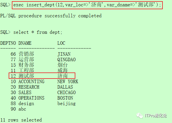 exec insert_dept(12,var_loc=>'济南',var_dname=>'测试部');