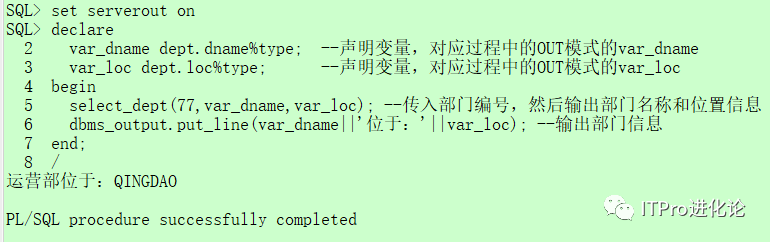 var_loc dept.loc%type; --声明变量,对应过程中的OUT模式的var_loc