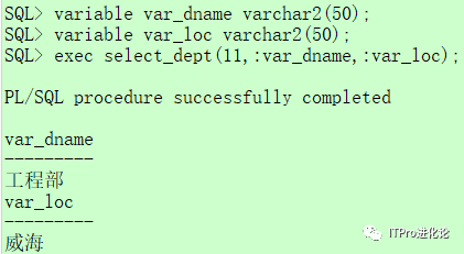 select_dept(77,var_dname,var_loc); --传入部门编号,然后输出部门名称和位置信息