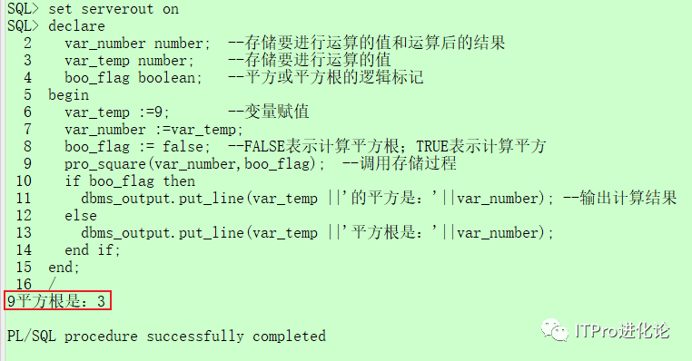 dbms_output.put_line(var_temp ||'平方根是:'||var_number);