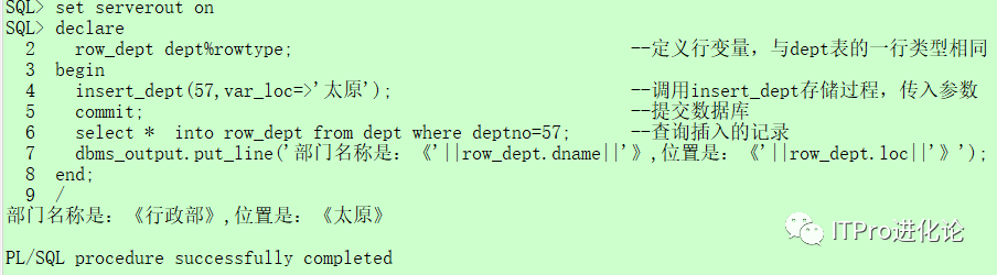 insert_dept(57,var_loc=>'太原'); --调用insert_dept存储过程,传入参数