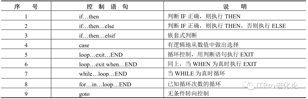 流程控制语句是所有过程性程序设计语言的关键,因为只有能够进行流程控制才能灵活地实现各种操作和功能,PL/SQL也不例外,其主要控制语句及其说明如下表所示: