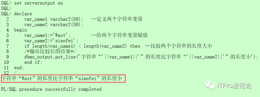 dbms_output.put_line('字符串“'||var_name1||'”的长度比字符串“'||var_name2||'”的长度小');