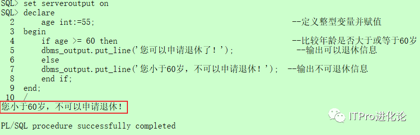 dbms_output.put_line('您小于60岁,不可以申请退休!'); --输出不可退休信息