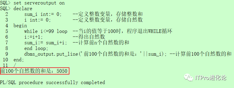 dbms_output.put_line('前100个自然数的和是:'||sum_i); --计算前100个自然数的和