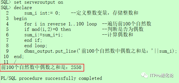 dbms_output.put_line('前100个自然数中偶数之和是:'||sum_i);