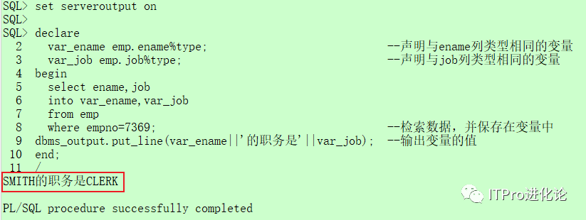 dbms_output.put_line(var_ename||'的职务是'||var_job); --输出变量的值