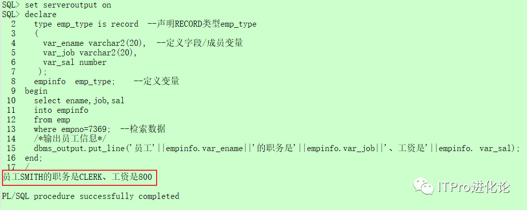 声明一个记录类型emp_type,然后使用该类型的变量存储emp表中的一条记录信息,并输出这条记录信息,代码如下:
