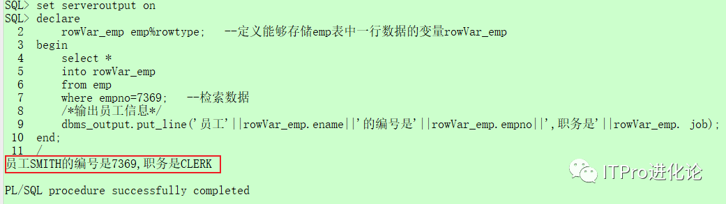 使用%TYPE类型的变量输出emp表中编号为7369的员工名称和职务信息,代码如下: