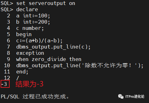 declaer关键字声明两个整型(int)变量a和b的初始值分别为100和200,声明变量c为数值型(number);在PL/SQL块的执行部分计算出这两个整数的和与它们之间差的商,并调用“dbms_output.put_line(c); ”语句输出计算结果。为了防止除数为零的情况发生,代码块中还设置了异常处理部分,一旦发生除数为零的情况,代码块就会通过调用“dbms_output.put_line('除数不允许为零!');”语句向用户输出提示信息。