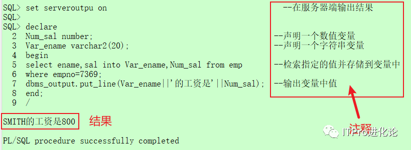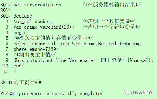 dbms_output.put_line(Var_ename||'的工资是'||Num_sal); --输出变量中值