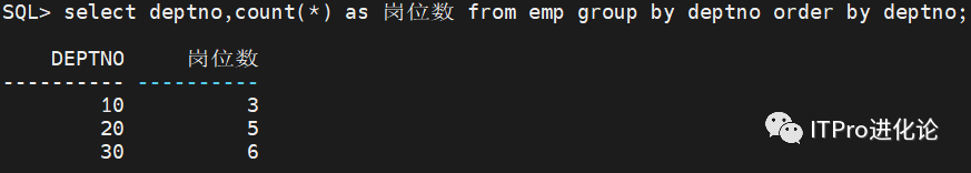 select deptno,count(*) as 岗位数 from emp group by deptno order by deptno;