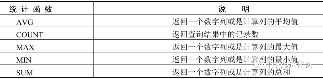 GROUP BY子句经常与聚集函数一起使用。使用GROUP BY子句和聚集函数,可以实现对查询结果中每一组数据进行分类统计。在Oracle系统中,经常使用的统计函数及其说明如下表: