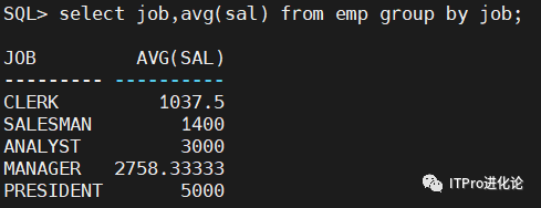 通过group by子句将job列按相同数据进行分组,然后avg(sal)计算出每一组的平均工资;