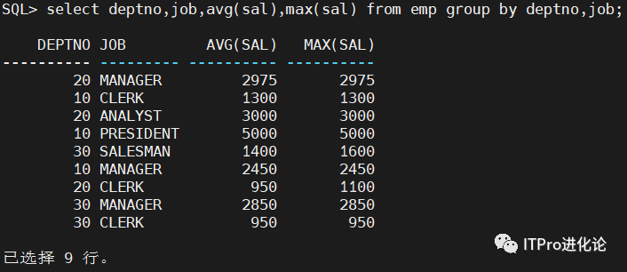 select deptno,job,avg(sal),max(sal) from emp group by deptno,job;