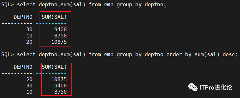 select deptno,sum(sal) from emp group by deptno order by sum(sal) desc;