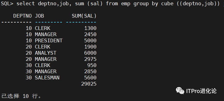 group by rollup((deptno,job)) 等同于group by(deptno,job)与group by()的并集,即特定部门特定岗位的工资总额与所有员工的工资总额的并集,不包括部门工资总额;