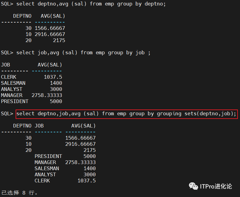 使用grouping sets(deptno,job)既显示了部门平均工资,又同时显示了岗位平均工资;