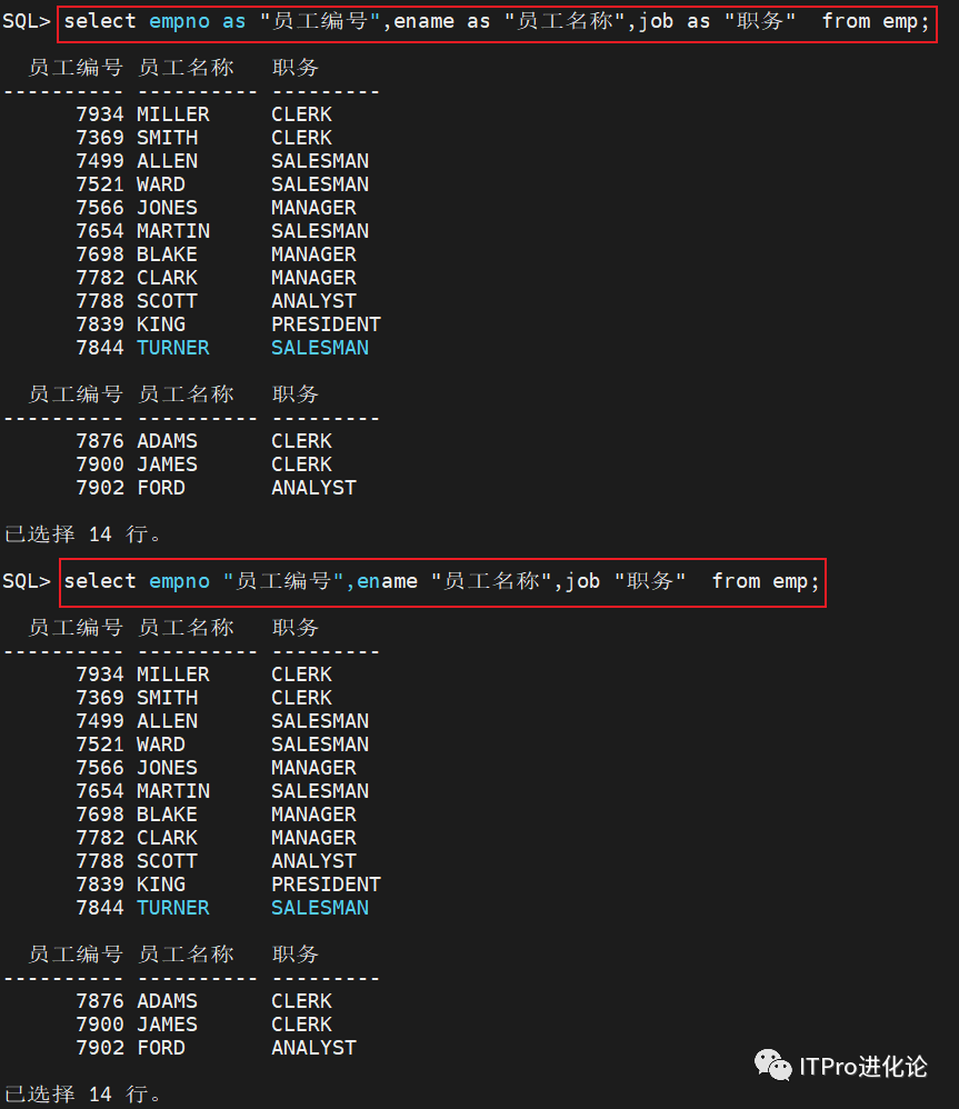 select empno as "员工编号",ename as "员工名称",job as "职务" from emp;