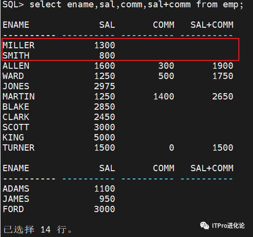 --comm列值为NULL的,计算sal+comm的值也为NULL