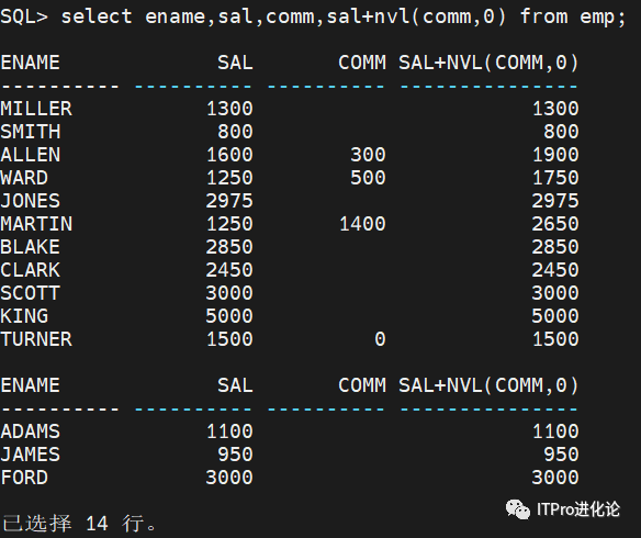 --使用NVL函数处理comm列,如果值为数值,返回原数值,如果值为NULL转换成0