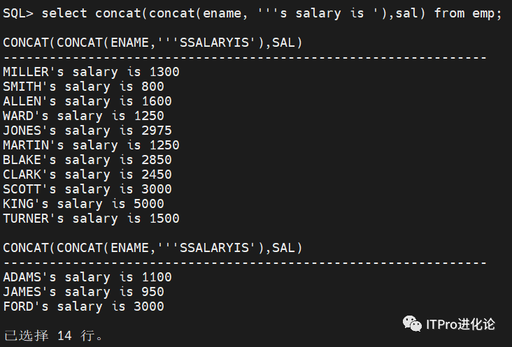 select concat(concat(ename, '''s salary is '),sal) from emp;