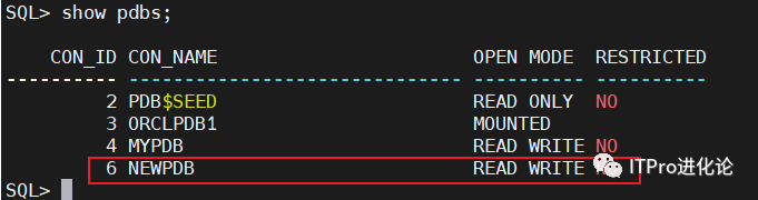 可以看到所有的PDB及状态,切换到NEWPDB,进行本地用户创建;