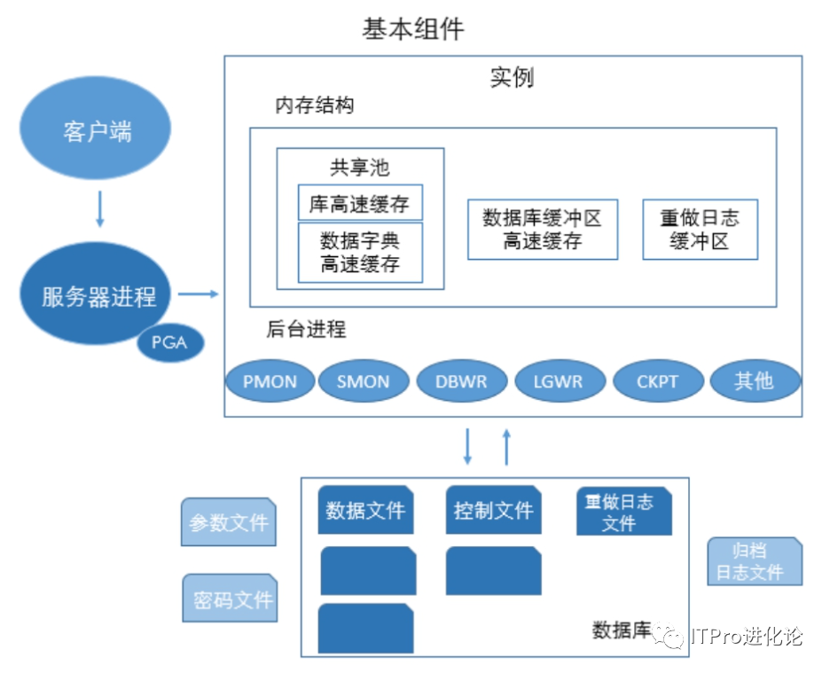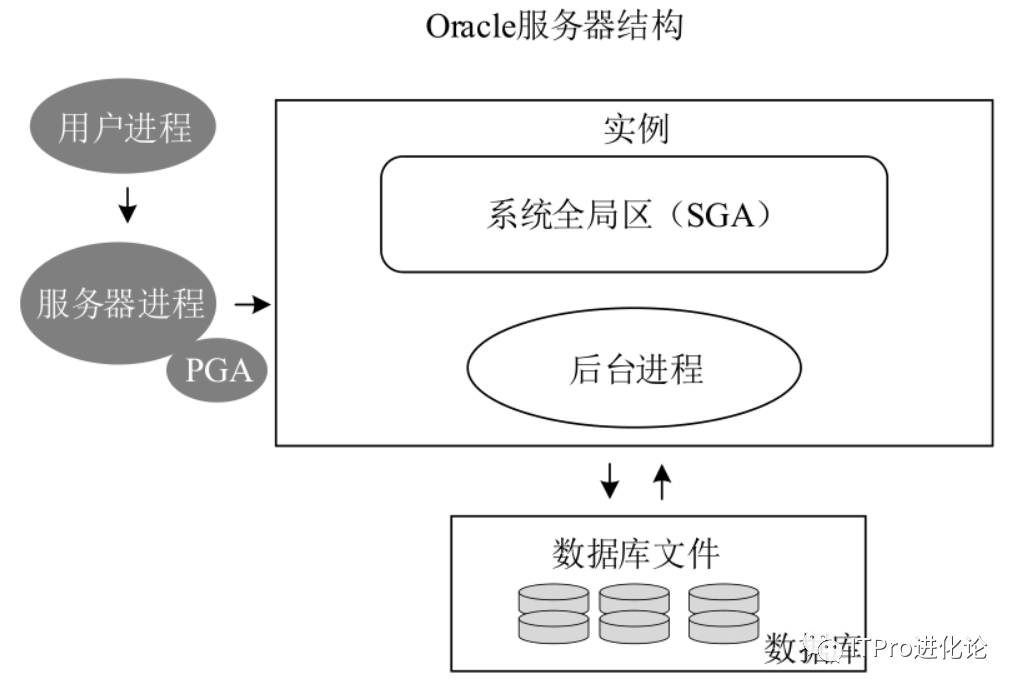 实例(Instance)——一组Oracle后台进程以及在服务器中分配的共享内存区域; 数据库(Database)——由基于磁盘的数据文件、控制文件、日志文件、参数文件和归档日志文件等组成的物理文件集合; 数据库服务器(Database Server)——指安装了数据库管理系统的服务器,用于存储和管理数据;