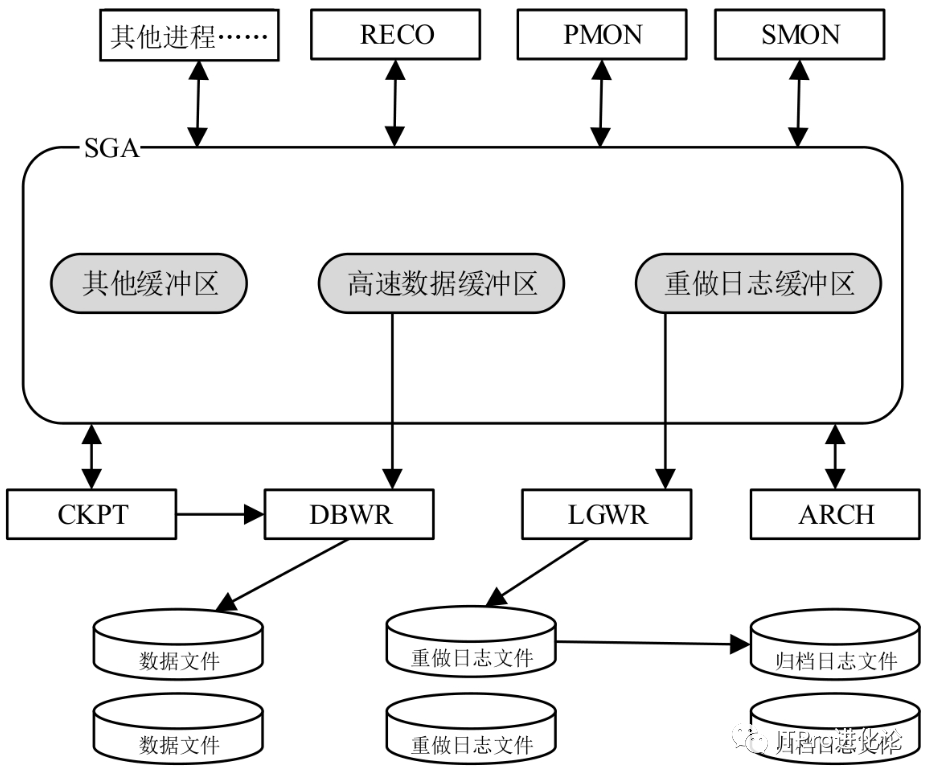 Oracle后台进程是一组运行于Oracle服务器端的后台程序,是Oracle实例的重要组成部分。如下图,其中SMON、PMON、DBWR、LGWR和CKPT这5个后台进程必须正常启动,否则将导致数据库实例崩溃。
