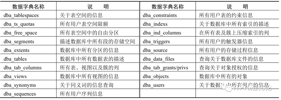 基本数据字典主要包括描述逻辑存储结构和物理存储结构的数据表,还包括一些描述其他数据对象信息的表,如dba_views、dba_triggers、dba_users等。