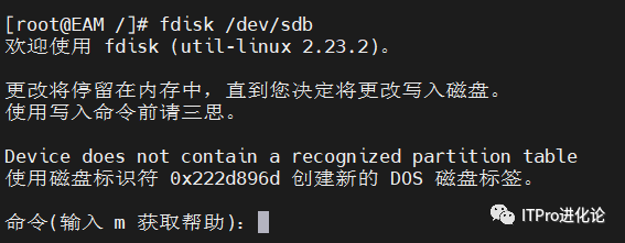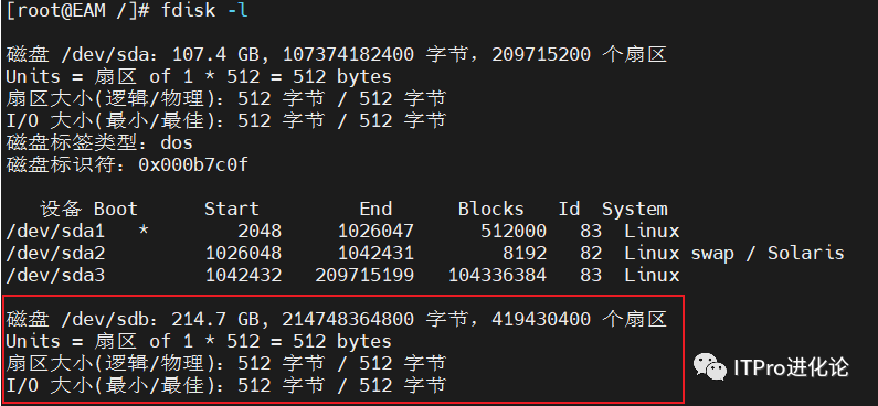 使用fdisk -l命令查看系统所挂载的硬盘个数及分区情况;下图可以看到磁盘 dev/sda已经挂载且分为3个分区,磁盘 dev/sdb未挂载;