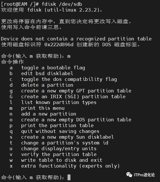a 设置可以到标记 b 编辑bsd磁盘标签 c 设置DOS操作系统兼容标记 d 删除一个分区 g 创建一个新的空GPT分区表 G 创建一个IRIX(SGI)分区表 l 显示已知的文件系统类型 m 显示帮助菜单 n 新建分区 o 建立空白DOS分区表 p 显示分区列表 q 不保存退出 s 新建空白SUN磁盘标签 t 改变一个分区的系统ID u 改变显示记录单位 v 验证分区表 w 保存退出 x 附加功能(仅专家)