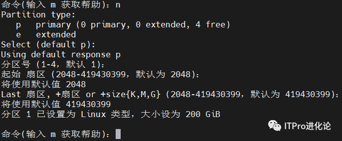 ④Select(default p)默认是p主分区,这里使用默认,直接敲回车,显示如下: