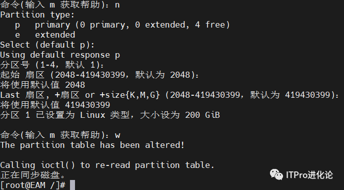 ⑦这里我们只创建一个分区,所以Last 扇区直接使用默认值即可,直接敲回车,显示如下图,分区完成;