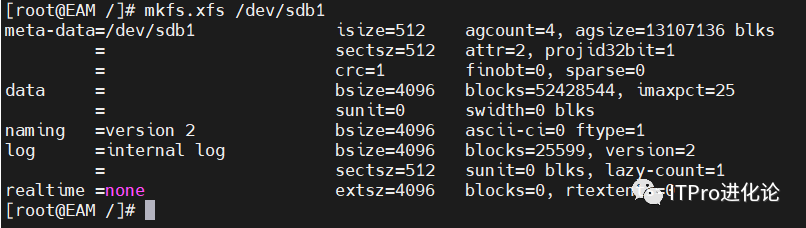 这里使用mkfs.xfs命令将未挂载的硬盘格式化成xfs的文件系统,输入命令:mkfs.xfs dev/sdb1