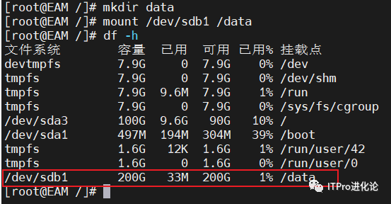 下图可以看到/dev/sdb1已经挂载到/data目录上了;