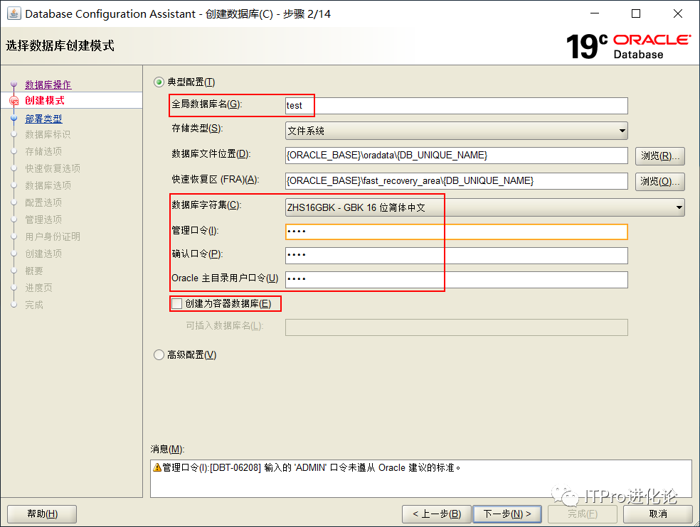 ),【数据字符集】选择【GBK 16位简体中文】,取消勾选【创建为容器数据库】,点击【下一步】;