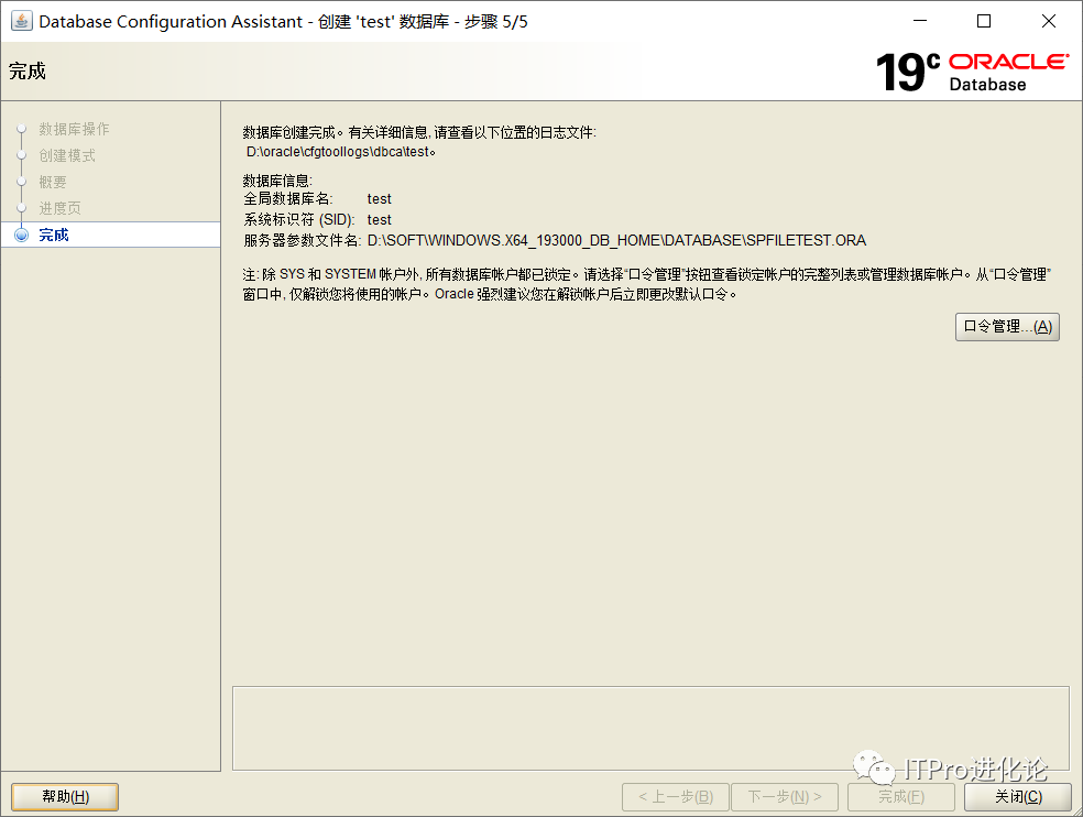 step6: 【完成】窗口查看创建数据库的最终信息,点击【关闭】完成数据库的创建。