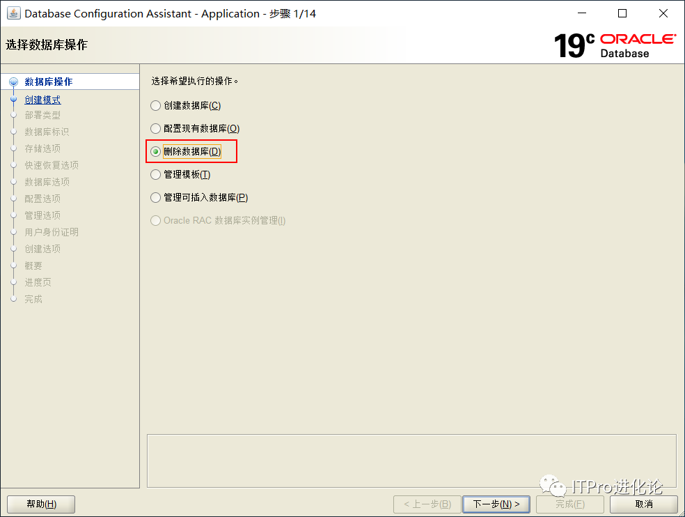 step2: 【数据库操作】窗口选择【删除数据库】,点击【下一步】;