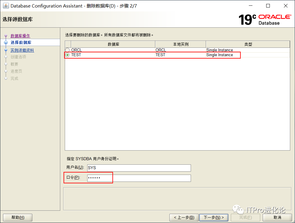 step3: 【选择数据库】窗口,选择要删除的数据库,输入数据库管理员的用户名和口令,点击【下一步】;