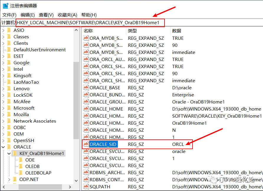 这是因为删除数据库后,ORACLE_SID并没有修改过来,此时需要恢复安装时的默认值为“ORCL”。具体操作方法:在【运行】对话框中输入“regedit”并按【Enter】键,打开系统的注册表页面,依次找到 HKEY_LOCAL_MACHINE\SOFTWARE\ORACLE\KEY_OraDB19Home1 项目下的ORACLE_SID,右击并在弹出的快捷菜单中选择【修改】命令,打开【编辑字符串】对话框,修改数据为“ORCL”,单击【确定】按钮即可。